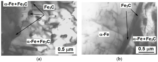 SEM data are confirmed by TEM data, according to which it is established that unmodified and modified ductile cast iron consists of the ferrite-perlite matrix and graphite rosettes. According to TEM data, in ductile cast irons before and after the MM introduction, the ferrite-perlite structure is of defective nature in Figure 2 and Figure 3. The dislocation density in the perlite structure of the unmodified ductile cast iron amounts to ~1.19 × 1010 cm−2, in ferrite—~1.0 × 1010 cm−2 (Figure 4). After the MM introduction into the melt of ductile cast iron, the dislocation density, which equals ~0.61 × 1010 cm−2 for perlite and ~0.47 × 1010 cm−2 for ferrite, reduces (Figure 5).