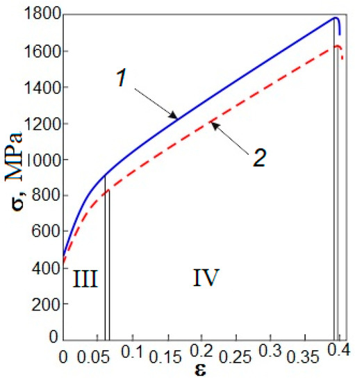 As a result of modification of ductile cast iron, yield strength σ0.2 was reduced by 40 MPa. Tensile strength σB reduced during compression from 1780 MPa to 1620 MPa. At the same time, elongation δ was virtually retained (Figure 6, Table 2). The durations of stage III ΔεIII and stage IV ΔεIV remain unchanged. The strain-hardening coefficient at stage IV ΔσIV reduced slightly after the MM introduction. Hardness and density of ductile cast iron after the MM introduction did not change and were 286 HB ± 5% and 7200 ± 100 kg/m3, correspondingly.
