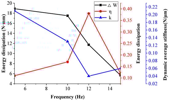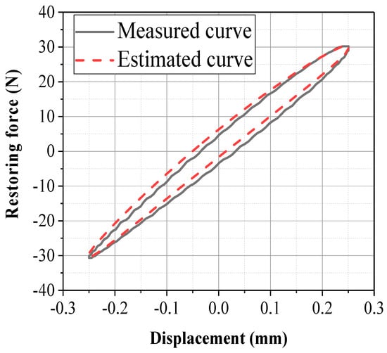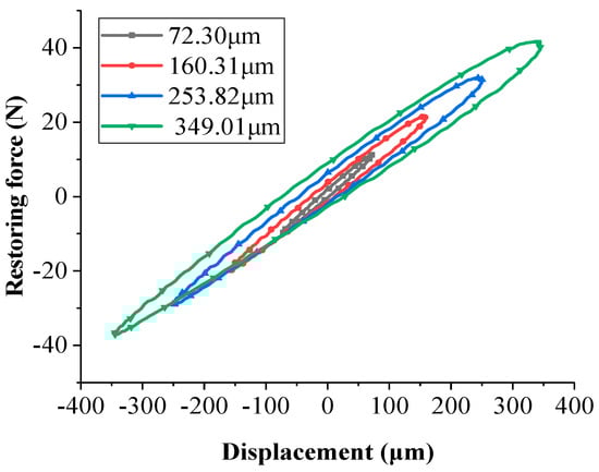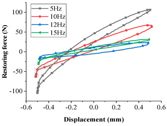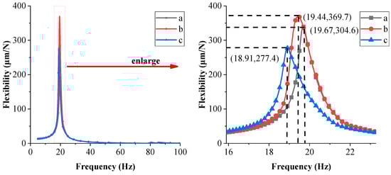 - When the exciting force was 3 N, the resonant frequency in the forward frequency sweeping test (Figure 5 (Line c)) was 18.91 Hz, and the flexibility was 277.4 μm/N. When the exciting force was 1 N, the resonant frequency in the forward frequency sweeping test (Figure 5 (Line a)) was 19.67 Hz, and the flexibility was 340.6 μm/N. It was found that the resonance peak of the sweeping curve drifted towards low frequencies, and the height of resonance peak was reduced at a high exciting force. This indicated that the increase of exciting force order led to a stiffness reduction and damping energy dissipation enhancement of the coated damping structure for metal rubber of bellows.