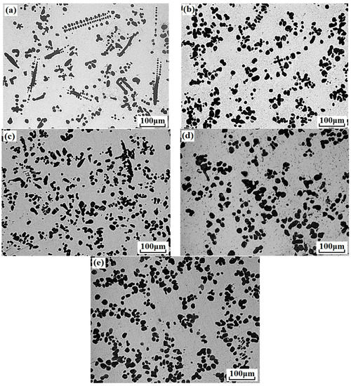 Figure 3 presents the microstructure of Cu-14Fe alloys solidified with and without AMF. The typical microstructures of the Cu-Fe alloys without AMF are a primary Fe phase distributed in the Cu matrix with random orientations, which is shown in Figure 3a. With the application of AMF, however, the number of developed Fe dendrites and irregularly-shaped grains is reduced and the morphology of the primary Fe phase transforms from dendritic structures to rosettes or spherical grains while Fe phases are further refined and more uniformly distributed (20 mT), which is shown in Figure 3b.With the increase in the magnetic flux density, the secondary dendritic arms of Fe dendrites are shortened and transformed into spherical grains (25 mT), which is shown in Figure 3c. Figure 4 plots the average Fe grain size as a function of magnetic flux density where the grain size of the primary Fe phase exhibits significant refinement under AMF and decreases with the magnetic flux density. With the magnetic flux density of 25 mT, the average Fe grain size of 11.5 μm represents a decrease of about 25% from that of a grain solidified without AMF. However, the grain size exhibits a certain amount of coarsening when the magnetic flux density exceeds 33 mT, which is shown in Figure 3d,e.