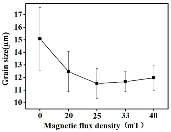 Based on these phenomena, the AMF influences the grain growth process through the variation of the temperature and solute fields, which transforms the morphology of the solidification structure. The magnitude of the magnetic flux density also has a significant influence on the grain growth where an increased magnetic flux density enhances the electromagnetic force present in the melt and produces a more intense convection therein. Therefore, the effects of the AMF on grain refinement and dispersed distribution are more significant. According to the electromagnetism theory, when a current J is supplied on a metal with a resistivity ρ, it will generate a heat Q [34].