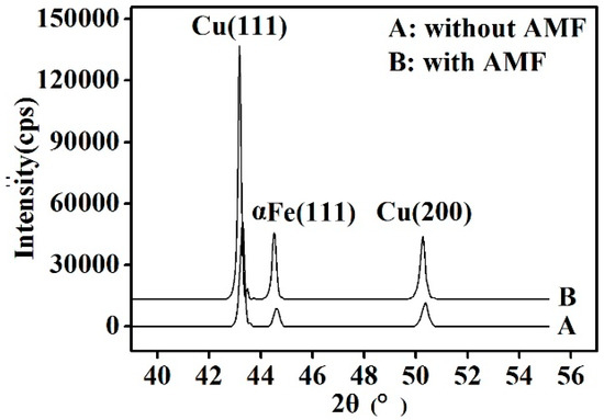 Figure 5 shows the phase structures of Cu-14Fe alloys solidified with and without AMF. In both cases, the alloys are composed of Cu and α-Fe. Figure 6 shows the TEM image of Cu-14Fe alloys (a) and selected are a diffraction (SAED) patterns (Figure 6b,c). According to the result of SAED, the phase structures of the primary Fe phase and Cu matrix are b.c.c. (body-centered cubic) and f.c.c. (face-centered cubic), respectively.