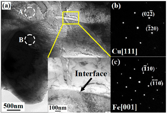(a) TEM images and selected area electron diffraction (SAED) patterns of (b) Cu matrix and (c) primary Fe phase.