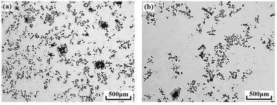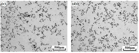 Figure 7 shows the solidification structure at the top and bottom of Cu-14Fe ingots solidified with and without AMF (20 mT). As shown in Figure 3, the typical solidification structure of the Cu-14Fe alloy is a uniform distribution of the primary Fe phase in the Cu matrix. Figure 7a,c present the microstructure at the top and bottom, respectively, of a Cu-14Fe ingot solidified without AMF where it can be seen that obvious macro-segregation occurs in the ingot. The Fe dendrites are distributed unevenly. The Fe phase is almost nonexistent at the bottom of the ingots, which is shown in Figure 7c while the volume fraction of the Fe phase is relatively higher at the top. The ingot top simultaneously exhibits serious hole defects, which is shown in Figure 7a. The holes present a round shape with smooth unoxidized boundaries typical of gas holes. Figure 7b,d show the microstructure at the top and bottom, respectively, of a Cu-14Fe ingot solidified with AMF where the primary Fe phase exhibits a more even distribution in the Cu matrix at the bottom, which is shown in Figure 7d. No hole defects are visible at the top, which is shown in Figure 7b. Therefore, the application of AMF during the solidification process of Cu-14Fe alloys can significantly reduce macro-segregation and hole defects.
