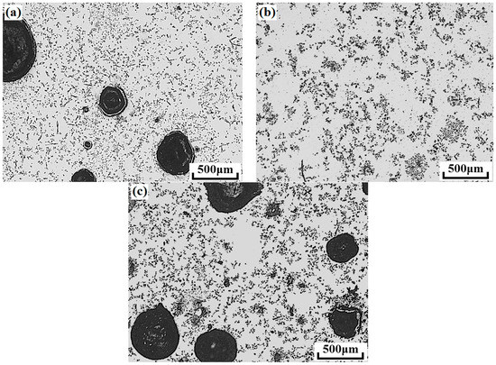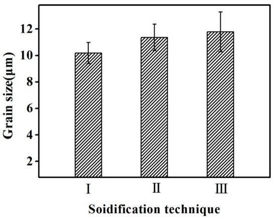 Figure 9 presents the solidification structure of Cu-14Fe alloys solidified with various solidification techniques, which is defined in Table 2. We observed that gas hole defects are present in the ingots solidified under Technique I, which is shown in Figure 9a and Technique III, which is shown in Figure 9c. We observed that the ingot quality was optimized with Technique II, which is shown in Figure 9b. The primary Fe phases were observed to be distributed uniformly in the Cu matrix for the various AMF operating temperatures, but, as the temperature decreases, the dispersed Fe grains have a tendency to aggregate and the Fe grains form an obvious clustered aggregation under Technique III, which is shown in Figure 9c. Figure 10 plots the average Fe grain size for the various solidification techniques where it is clear that the Fe grains in the ingot solidified using Technique I are slightly finer than those solidified with the other techniques.
