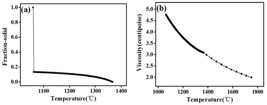 Calculated values of Cu-14Fe alloy thermophysical parameters. (a) Solid Fraction-Temperature curve and (b) Viscosity-Temperature curve.