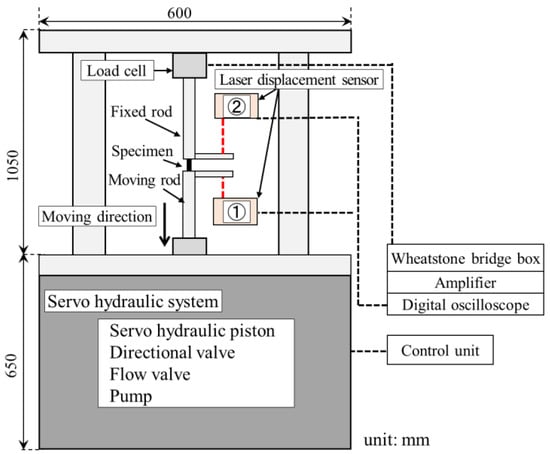 First, to stabilize the flow of the hydraulic system, the piston moved downward without the load. Then, since the piston pulled the moving rod, the tensile load was applied to the specimen. Additionally, the displacement increased with the plastic deformation of the specimen. The specimen deformation was calculated by subtracting the outputs of two displacement sensors (sensor ① and ②). Because the pressure of the servo-hydraulic system increased slightly during the test, the strain rate also increased. The average strain rate during the test was calculated.