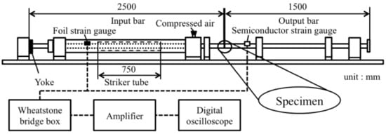 The SHB method [2,3] was used in the impact tensile test. Figure 3 shows the configuration of the SHB apparatus (Institute of Space Dynamics, ST-R-5000, Kyoto, Japan) [18]. The main components of this apparatus are the striker, input bar, and output bar. After the striker impacts the yoke, the tensile stress wave propagates through the input bar. When the wave reaches the specimen, part of it propagates through the output bar and the remaining part is reflected on the specimen. These waves were measured by using a foil strain gauge (KYOWA, KFG-2-120-C1-16, Tokyo, Japan) and semiconductor strain gauge (KYOWA, KSP-1-350-E4, Tokyo, Japan), which attached to the input and output bars, respectively. The sampling rate was 1 MHz.