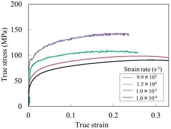 The stress–strain relationship of the 1070 is shown in Figure 4. The flow stress increased significantly with the strain rate. It can be said that the 1070 exhibited a positive strain rate dependence, which is common behavior for 1100 [19,20].
