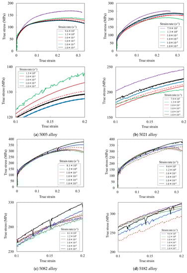 Figure 5a–d shows the stress–strain relationship of the AA5xxx series aluminum alloys and these enlarged views. In the 5005 alloy, a positive strain rate dependence was observed. However, in the 5021 alloy, which had a larger amount of Mg in comparison with the 5005 alloy, the serration behavior could be confirmed in the strain rate range of 10−4 to 10−2 s−1. Additionally, the negative strain rate dependence could be confirmed. However, the flow stress at the impact strain rate (7.9 × 102 s−1) increased in comparison with the results obtained by the quasi-static test. In contrast, in the 5082 and 5182 alloys, the negative strain rate dependence was strong because the added Mg amount was large and induced serration in the quasi-static strain rate range of 10−4 to 10−1 s−1. For the 5182 alloy, the flow stress increased slightly from the strain rate of 10−1 s−1 to the impact strain rate. This result was different from the result obtained with the 5082 alloy, which contained almost the same amount of Mg.
