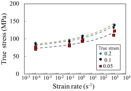 Table 2 summarizes the material constants that were determined to minimize the error between Equation (7) and the experimental result obtained with 1070. Figure 6 shows the relationship between the flow stress and the strain rate at the true strains of 0.05, 0.1, and 0.2 in the 1070. The curve obtained from Equation (7) is also shown in Figure 6. The increase in the flow stress as the strain rate increased had a tendency that was similar to the relationship between the flow stress and the strain rate of the 1100 aluminum [23].