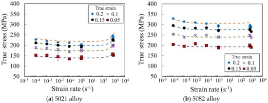 The material constants of the AA 5xxx series aluminum alloys were determined by changing the constants of Equation (8) and are summarized in Table 3. The relationship between the flow stress and the strain rate of the 5021 and 5082 alloys indicated a typical behavior, as shown in Figure 7. The curves obtained from Equation (8) are also shown in this figure. The change of the flow stress with the increasing strain rate roughly agreed with the model shown in Equation (8). For both the 5021 and 5082 alloys, it was possible to confirm a negative strain rate dependence up to the strain rate of approximately 100 s−1.