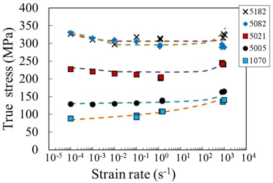 In the 5182 alloy, the flow stress decreased monotonically as the strain rate increased from 1 × 10−4 to 1 × 10−2 s−1. However, the flow stress increased when the strain rate increased from 1 × 10−1 s−1 to approximately 1 × 103 s−1 in comparison with above strain rate range. This behavior was similar to the relationship between the strain rate and the flow stress of the same alloy, which has been reported by a previous study [26]. However, it was different from the behavior of the 5082 alloy, which contained almost the same Mg amount. Because the average grain sizes of the 5082 and 5182 alloys were 32 and 29 μm, respectively, as shown in Table 1, it was considered that their influence was negligible. Thus, the effect of additives was considered because both alloys differed in the amount of Mn content.