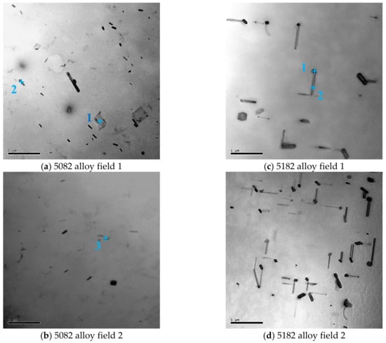 TEM images of 5082 and 5182 alloys. (a) 5082 alloy field 1, (b) 5082 alloy field, (c) 5182 alloy field 1, (d) 5182 alloy field 2.