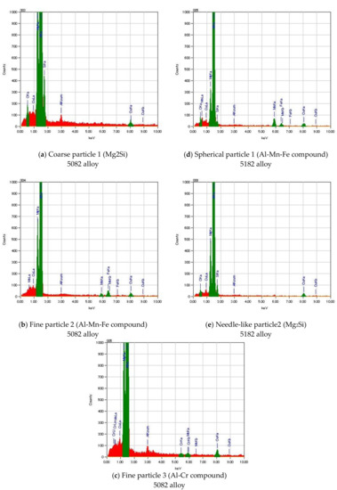EDS analysis of particles for 5082 and 5182 alloys in Figure 9. (a) Coarse particle 1 (Mg2Si) in 5082 alloy, (b) Fine particle 2 (Al-Mn-Fe compound) in 5082 alloy, (c) Fine particle 3 (Al-Cr compound) in 5082 alloy, (d) Spherical particle 1 (Al-Mn-Fe compound) in 5182 alloy, (e) Needle-like particle2 (Mg2Si) in 5182 alloy.