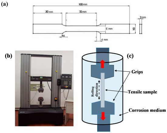 The material used in this study was a commercially supplied 6082 wrought aluminum alloy sheet. Its wt.% chemical composition was 1.1% Si, 1% Mg, 0.7% Mn, 0.1% Cu, 0.5% Fe and Al made up the balance. Specimens of 40 mm × 20 mm × 2 mm were cut from this sheet for the corrosion experiments. Standardized ASTM E-8M tensile specimens were also cut from the same sheet. A schematic of the tensile sample is given in Figure 1a. All specimens were then mechanical grinded with SiC paper with increasing finishes, until the resulting roughness was approximately 0.4 μm (measured with a Marr Perthen Profilometer—Mahr GmbH, Göttingen, Germany). The roughness tests were considered essential so as to ensure that the surface topography of all samples was similar.