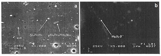 Figure 2a shows the typical microstructure of a T6 treated 6082 aluminum alloy. Apart from the aluminum solid solution, two different intermetallic phases could be observed, namely Al96Fel0Mnl4Sil8 and All4Fe3Si3 []. These phases appear to be well distributed within the matrix of this alloy. Further electron backscattering analysis at the grain boundaries of the alloy revealed the presence of fine β″ (Mg5Si6) precipitates [], which are mainly dispersed along the grain boundaries (see Figure 2b).