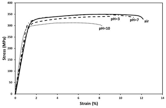 Effect of the pH of 0.3 M NaCl solution on the stress-strain curves of T6 treated 6082 aluminum alloy, obtained from the slow strain rate test (SSRT).