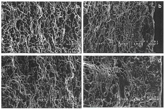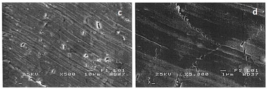 To date, it is still unknown if the main stress corrosion cracking mechanism in Al-Mg-Si alloys is the easy path corrosion or the hydrogen embrittlement []. The authors believe that, in the case of acidic pH value (pH = 3) an intergranular corrosion cracking mechanism takes place. On the other hand, when the SCC tests were performed in an alkaline environment (pH = 10), a hydrogen embrittlement mechanism is dominant. This can also be explained by McCaferty’s theory [,]. According to this theory in alkaline environments, when the pH is higher than the pzc, the surface of the aluminum oxide (Al2O3) has a net negative charge and cations (H+) can be adsorbed. After this, the cations can penetrate or dissolve through the oxide film and dissolve or form hydrides with the underlying metal. It has been proved that solute hydrogen atoms often act as dislocation pinning sites, which increase the surface hardness []. This theory explains the high arrogation loss of the material when tested in alkaline environments and the low rtf value.