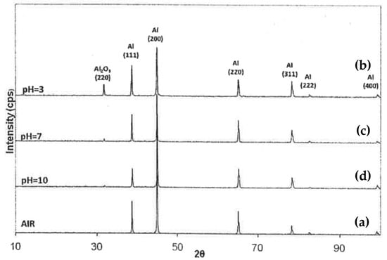 Analysis of the surface near the fractured area for all tested samples are presented in Figure 6. Some grinding lines due to the initial grinding can be discerned. In this figure, some distinctive patterns can be observed in each environment. For the 6082 aluminum alloy, which was SSRT tested in an acidic environment, an extended layer of corrosion products was observed. This layer was cracked due to tensile stresses (as indicated in Figure 6b). The corrosion products on the surface of the alloy were identified by XRD analysis to be mainly aluminum oxides (Al2O3), see Figure 7. However, when the SSRT tests were performed in a neutral pH, very limited corrosion products were observed (Figure 6c) and the surface morphology appeared to be very similar to that of the reference sample (experiment in air), see Figure 6a,c. In the case of SSRT testing in an alkaline pH, intergranular corrosion phenomena were seen (Figure 6d). This observation is attributed to the existence of precipitates along the grain boundaries, which have a different corrosion potential than that of the aluminum matrix. In particular, the β″ (Mg5Si6) precipitates might have a similar corrosion potential to the aluminum matrix, but intermetallic phases such a-(AlFeMnSi) and Al-Si-Mg have a higher corrosion potential when compared to the same matrix. Thus, galvanic corrosion can take place at the grain boundaries. Furthermore, some aluminum oxides (Al2O3) were detected on the surface of the alloy after SSRT test in pH = 10, but to a lesser extent in comparison to those formed in the acidic environment (Figure 6).