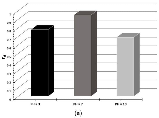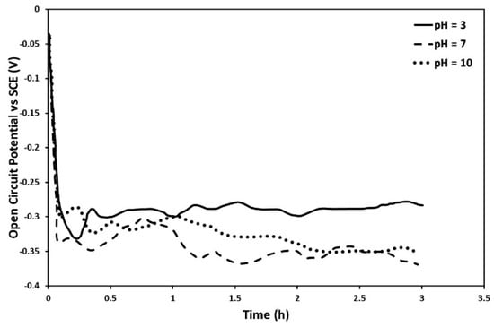 From the fractographic analysis of the samples after SSRT testing it is evident that the change in pH resulted in different surface morphologies. To get a better insight into the effect of corrosion on the surface of 6082 aluminum alloy and to better understand the synergism between corrosion and wear, potentiostatic corrosion experiments were performed. Figure 8 shows the evolution of open circuit potential (OCP) of T6 treated 6082 aluminum alloy as a function of immersion time, for the three examined pH values of 0.3 M sodium chloride (NaCl) aqueous solution. From this figure, it can be observed that the OCP of the specimens at pH = 7 and 10 was more noble than that of pH = 3. Indeed, it is known that the pH of the corrosion environment can affect the stability of the oxide film (Al2O3), according to the Pourbaix diagram []. In particular, in neutral pH values a stable Al2O3 oxide film is formed, passivating 6082 aluminum alloy and hindering the diffusion of the Cl− halide ions. Therefore, the corrosion phenomena are more intense in the acidic pH, when compared to neutral. In addition, hydrogen uptake will occur in an environment with alkaline pH []. However, it should be also taken into consideration that stress corrosion cracking involves the synergism between electrochemical and mechanical aspects. For example, mechanical stresses can accelerate the diffusion of halide and/or hydrogen ions enhancing corrosion and/or embrittlement phenomena []. On the other hand, the formation of corrosion products and surface defects (e.g., pits, blisters) are known to degrade the mechanical performance of materials [].