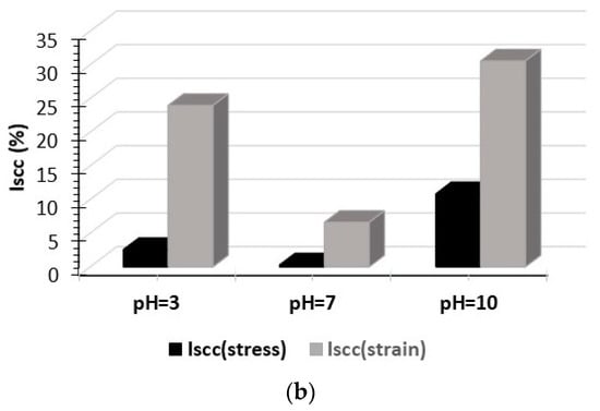 To better compare these different SCC conditions, the ratio of time-to-fracture (rtf) index was evaluated. This index is calculated according to the equation rtf = tfe/tfc, where tfe and tfc are the time to failure for the testing and control (air) environments, respectively. Figure 9a shows the rtf value of T6 treated 6082 aluminum alloy as a function of the pH of solution. From this figure it can be seen that this alloy is more susceptible to stress corrosion cracking in the alkaline environment, whereas the influence was very small at the neutral pH. In addition, the effect of pH on the stress corrosion resistance of T6 treated 6082 Al alloy was quantitatively assessed by using the susceptibility index ISCC []. This index is calculated by the following equation ISCC = [(εair – εscc)/εair] × 100, where εair is the elongation after testing in air (reference test) and εscc is the elongation after the SCC test. This index can be also described in terms of UTS []. The SCC susceptibility index is given in Figure 9b. Similar to the rtf index, the ISCC index also confirms that the alkaline, followed by the acidic pH has the strongest influence on both the ductility and UTS of the alloy.