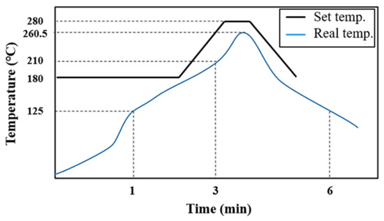 SAC305, SC07 and SC-Cr alloys were prepared from pure (>99.99 wt.%) metals by using induction heating in a high-vacuum argon atmosphere at 1100 °C for 1 h. Then, solder balls with diameters of 300 μm were fabricated by using gas atomizing methods. Cu pads with an organic solderability preservative (OSP) surface finish on flame retardant (FR-4) boards was employed as solder wetting substrates. The OSP layer was 0.3 μm in thickness and the bottom Cu layer was 230 μm in diameter and 20 μm in thickness. For sample preparation, the solder balls were coated with some flux, placed on the Cu pad and then reflowed by using an 9-zone reflow machine (1809-EXL; Heller, Florham Park, NJ, USA). After reflow, the test samples were cooled to room temperature in air. Figure 1 shows the setting temperatures and the real reflow profile for the SC-Cr, which is obtained by a reflow profile checker installed in the reflow machine. The peak temperatures of the SAC305, SC07 and SC-Cr solders were 250, 255 and 260.5 °C, respectively. Table 1 listed the processing parameters. Some of the samples were tested in a VT 7006 chamber (Votsch, Berlin, Germany) for 500 to 2000 shocks at a cyclic temperature range of −45–+125 °C, with each shock lasting 20 min (JESD22-104; JEDEC, Arlington, VA, USA).