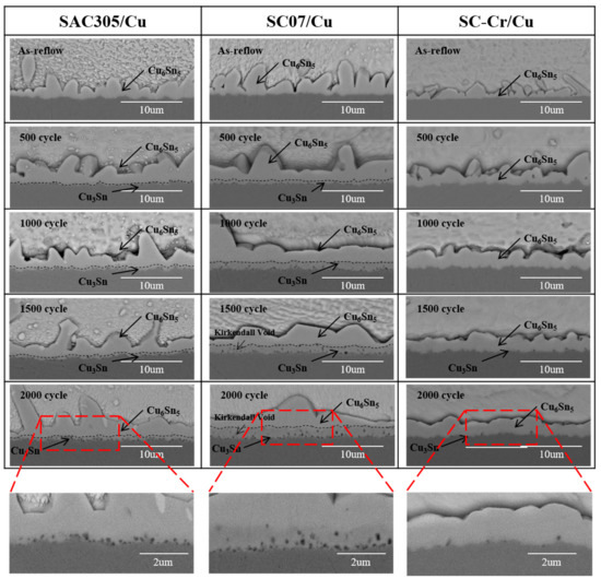 Figure 3 shows the cross-sectional microstructures of the IMC layers formed at SAC305/Cu, SC07/Cu and SC-Cr/Cu interfaces during thermal shock testing. Generally, the interfacial IMC became thicker and flatter with increasing thermal shocks. Compared with the interfacial IMC formed in the three reaction systems, the addition of Cr effectively inhibited interfacial IMC growth, especially the Cu3Sn IMC growth. Specifically, very few Cu3Sn IMC and Kirkendall voids were detected at the SC-Cr/Cu interface, even after 2000 cycles of thermal shock testing, whereas the Cu3Sn and Kirkendall voids were significant at the SAC305/Cu and SC07/Cu interfaces after 1000 cycles. To quantify the difference, the thicknesses of the IMC layers formed in the three reaction systems were measured using imaging analysis methods. Compared with the results plotted in Figure 4, Cr inhibited the interfacial IMC growth primarily by slowing down the Cu3Sn growth.