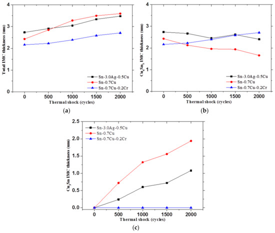 Plot of the thickness of IMC versus thermal shock cycles: (a) Total IMC thickness, (b) Cu6Sn5 IMC thickness, (c) Cu3Sn IMC thickness.