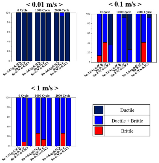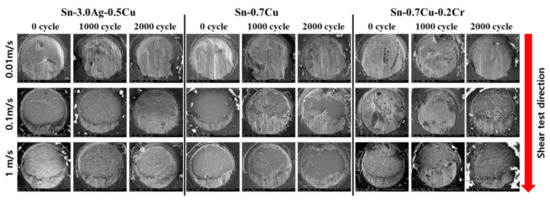 Figure 6 shows the variation of the solder joint strength with prolonged thermal shock test at various shear speeds. Generally, the shear strength of the solder joints decreased with thermal shock test. These results are consistent with Kim’s simulation [25,26] and Gain’s experiments [27,28]. Although the trends in shear strength with thermal shock testing were similar, significant differences were observed in terms of shear speeds: at a low shear speed (0.01 m/s), the SAC305/Cu solder joints exhibited highest strength, whereas SC-Cr/Cu solder joints show highest strength when the shear speed exceeds 0.1 m/s. As mentioned above, the difference should derive from the different fracture mechanisms under various shear speeds. To confirm this assumption, the fracture morphology of these solder joints was observed and classified, as shown in Figure 7 and Figure 8. All the fractures exhibited ductile fracture morphology at a low shear speed, whereas the brittle fracture becomes dominant when the shear speed exceeds 0.1 m/s. The results indicate that the joint strength is determined by the solder matrix strength in the case of a low shear speed and more relies on the interfacial connection in the case of a high shear speed.