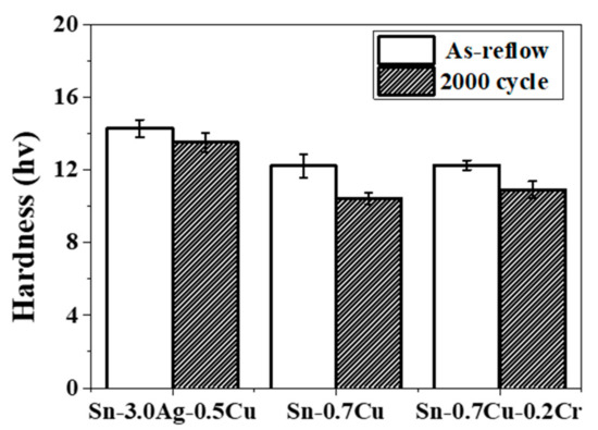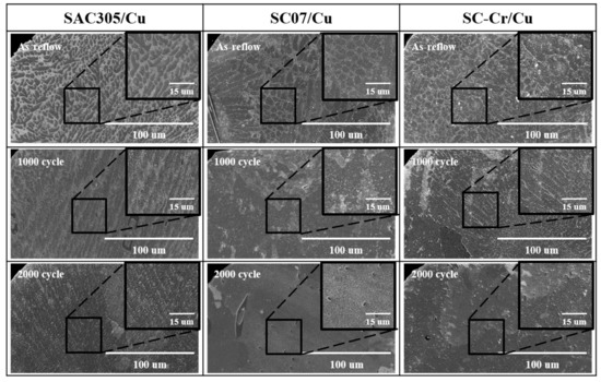 Recently, SnAgCu (SAC) solders have been most widely used in automobile electronics [5]. In terms of wettability and operation temperature, the SAC solders perform well. However, due to numerous brittle Ag3Sn intermetallic compounds (IMC) existing in the matrix, the SAC solder exhibits poor drop reliability, which is a significant threat, because the joints are always subject to vibrations of 3 Grms to 20 Grms in actual operation conditions [6]. Additionally, cost is another important factor that limits the SAC solder application. It should be noted that Ag is a noble metal, whose price is approximately 30 times higher than that of Sn. A 1% reduction of Ag in a solder alloy results in at least a 15% reduction of the total solder cost. Currently, commercial imperatives to reduce costs have raised considerable interest in lowering the Ag content of SAC solder alloys to reduce the base alloy cost, especially in the context of decreasing profits in electronics manufacturing due to intense competition [7,8,9]. In this context, Ag-free solders, specifically the eutectic SC07 solder, has attracted much attention in automotive electronic applications because of the low cost and good drop reliability. Unfortunately, the drawback of Sn-Cu solder is also obvious. The IMC growth at the SnCu/Cu interface is much faster than that at the SAC/Cu interface. A too-thick IMC layer deteriorates the solder joint reliability because the IMC is brittle and possess lots of defects, such as Kirkendall voids inside [1,10]. Therefore, the prevention of excessive growth of IMC is of interest to materials researchers. Recently, several research groups have focused on developing composite electronic interconnect materials doped with metallic (e.g., Ni, Ag, Al, Co, Cr, etc.) [11,12,13,14,15,16,17] and ceramic (Al2O3, ZrO2, CeO2, etc.) [17,18,19] particles to control their interfacial microstructure and mechanical properties. For example, a trace amount of Cr in lead-free SnZn solder could repress the atomic diffusion and therefore reduce the interfacial IMC growth [15,16]. However, the effect of Cr addition in the SnCu/Cu system has not been systemically evaluated in the literature.