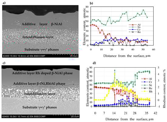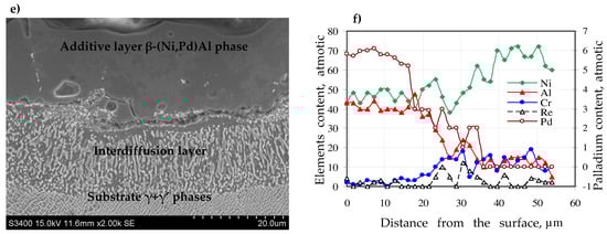 Microstructure on the cross-section of the non-modified (a), rhodium-modified (c), palladium-modified (e) aluminide coating and elements’ distribution on the cross-section of the non-modified (b), rhodium-modified (d) and palladium-modified (f) aluminide coating.