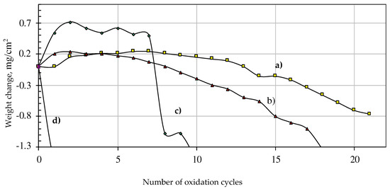 Oxidation kinetics curves (Figure 2) were prepared to show resistance to oxidation under cyclic conditions of coatings and bare superalloy. Each one of the coatings exhibits a rapid weight growth during first cycles of oxidation which was caused by quick oxide layer formation. The obtained results indicate that the best oxidation resistance exhibits rhodium-modified aluminide coatings, which failed after 13 cycles (Figure 2a). Weight change that reaches up to 0.2 mg/cm2 is during the 3 cycles of oxidation. Afterwards, the weight change of coating is subtle until the 9th cycle when the weight of the sample starts to decrease slowly, which indicates the onset of oxide-scale spallation. Eventually, the coatings weight fell below its initial value in the 14th cycle. The palladium-modified aluminide coating reaches a maximum weight gain of 0.2 mg/cm2 after 1 cycle of oxidation (Figure 2b). Afterwards, until approximately the 4th cycle, the weight change is subtle, probably due to repeated oxide-scale spallation and formation. After the 4th cycle the weight change of the coating decreases. Non-modified aluminide coating reaches the maximum weight change of 0.7 mg/cm2 in the 3rd cycle (Figure 2c). Such weight change is due to very fast oxide layer formation. Afterwards, the weight change is almost subtle and is about 0.6–0.5 mg/cm2, which is probably due to repeated oxide-scale formation and spallation. After the 7th cycle of oxidation, weight change quickly decreases, which is probably due to an inability of the oxide layer to heal after spallation. The weight change of bare CMSX-4 superalloy decreases after just 1 cycle of oxidation (Figure 2d). This is due to by-bed protective properties of the oxide layer that formed on its surface.