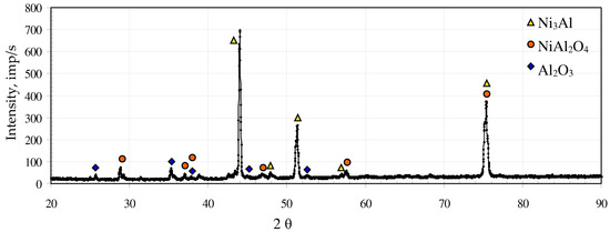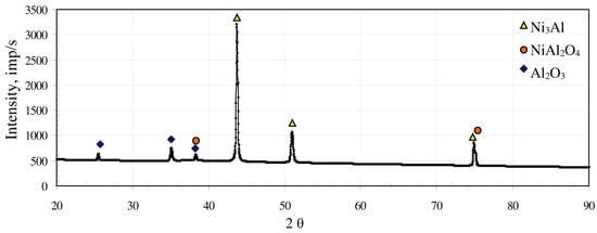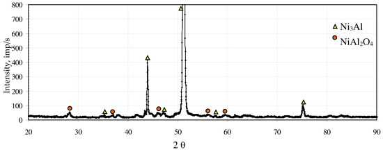 Chemical composition in microareas indicates that three types of oxides may coexist. Chemical composition of microareas 1 and 3 corresponds to (Ni,Cr)Al2O4 oxides. Above these microareas is slightly darker oxide layer, marked 2. The predominant elements present in this area are Al, O and Ni. There are also small amounts of Cr, Co and W. However, the concentration of the main elements indicates the presence of NiAl2O4 spinel, which was also detected using XRD (Figure 4). There are also some porous oxides (marked 4). Chemical composition of these regions indicates Ni-rich oxide occurrence. Chemical composition of the brightest and distinct areas marked 5 is very similar to that of the substrate alloy, which indicates that it was exposed by oxide layer spallation. A Ni3Al phase was identified by XRD analysis.