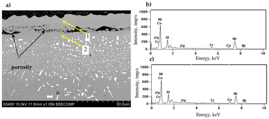 Cross-sectional microstructure of palladium-modified aluminide coating after oxidation at 1100 °C for 21 cycles (a), EDS spectrum of microarea 1 (b), EDS spectrum of microarea 2 (c).