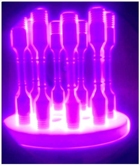 A sample holder developed by LPP (ITA), on which up to 10 samples could be mounted, allowed for the nitriding of all the specimens in a single lot. The sample holder drawing is shown in Figure 1 and a photo of the specimen during the process is shown in Figure 2. The samples were cooled inside the chamber.