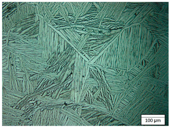 The different creep resistance results that were found in the literature [29,33,34,35], due to the various microstructures of Ti-6Al-4V alloy, indicate the need for a heat treatment to homogenize and to create the Widmanstätten microstructure prior to nitriding and testing. The optical micrograph of the sample with Widmanstätten microstructure is presented in Figure 4.