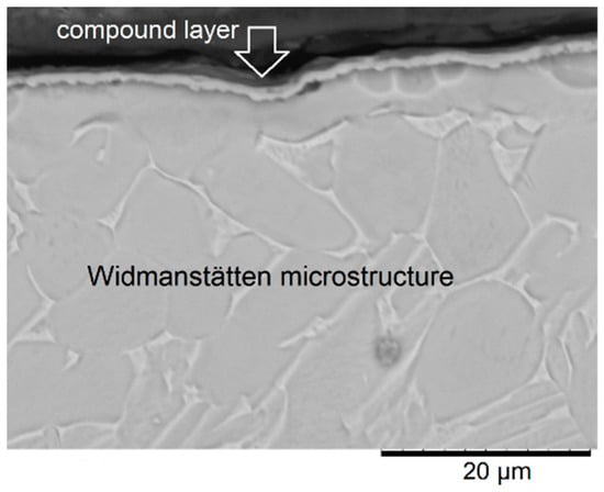 The SEM micrograph of the nitrided sample is shown in Figure 5. The thickness of the nitride layer was estimated to be nearly 1 µm in this sample. In the nitrided layer, only one present phase (darker gray) could be identified, which can be explained because nitrogen is an alpha phase stabilizing element that may have caused a wrapping to form a continuous layer (called an alpha casing) [2]. According to Rajasekaran and Morita [36,37], the formation of this nitride surface layer generated a surface residual compressive stress that helped to increase the creep resistance. This layer formation may also act as a barrier to oxygen diffusion into the material, contributing to the increase in creep resistance [10,38]. As reported by Pérez [38], for titanium and its alloys, the nitride layer reduces the contribution of oxygen dissolution in the substrate to the total mass gain. The better oxidation resistance of Ti nitrides when compared with the α-Ti is due to the strong interaction between titanium and nitrogen, which decreases the thermodynamic activity of titanium.