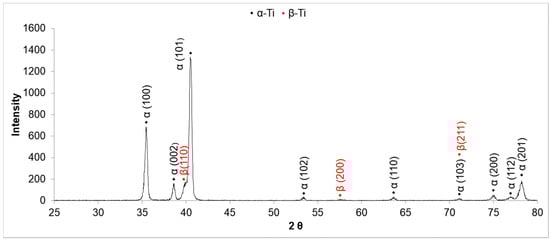 The XRD analysis performed on the as-received sample is presented in Figure 7. The diffraction pattern was fitted with α-Ti (JCPDS file 44-1294) and the β-Ti (JCPDS file 44-1288) phases, the same as was identified by other authors [19,22,25,39,40].