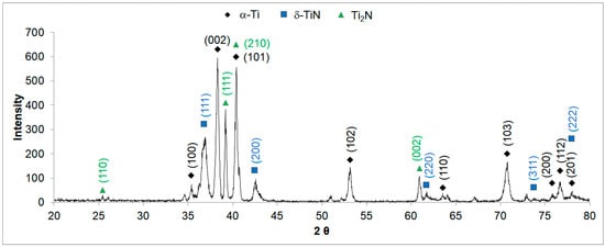 The XRD analysis that was performed on the plasma-nitrided sample is presented in Figure 8. The analysis confirmed the presence of the face-centered cubic δ-TiN (JCPDS file 38-1420) and the tetragonal ε-Ti2N (JCPDS file 17-0386) [19,22,39,41,42]. Also, the α-Ti phase was present, which was the same one that was found in the as-received sample. Rahman et al. [25] also observed the (111) and (200) diffraction planes of nitrogen-rich δ-TiN phase at temperatures above 700 °C. In this pattern, identifying the presence of the β-Ti phase using XRD was difficult when the α-Ti phase was also present. The most intense reflection of the β-Ti phase (110) was in a coincident position to a reflection of α-Ti phase (002), thus masking the result. As the amount of β-Ti phase in the alloy was relatively small and as the lower intensity of the other reflections did not coincide, it was practically impossible to ensure the presence of the β-Ti phase while using only XRD analysis [43].