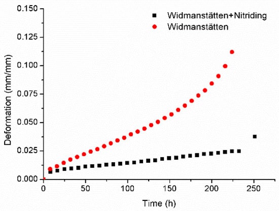 Creep data of the plasma-nitrided Ti-6Al-4V with Widmanstätten microstructure to untreated condition, data from Briguente [33].