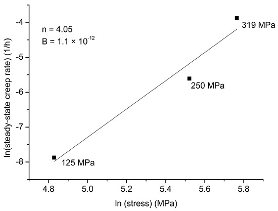 The logarithmic relationship between steady creep rates and stress is shown in Figure 10. Using standard regression techniques, the value of the stress dependence of the steady-state creep rate (n) can be described in terms of power-law creep equations [45]: