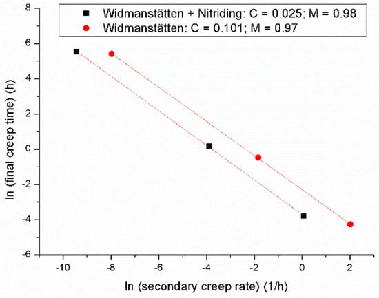 where M and C are the constants. The parameter M corresponds to a measurement of the influence of the secondary creep rate on the creep rupture time. In general, M values are found around the unit for various materials, indicating the proportionality between the rupture time and the rate of deformation in the secondary stage, as proposed by Monkman and Grant [54]. The C value may be related to the ductility of the material. In general, low C values are associated with low creep ductility. Figure 12 shows the correlation between time to fracture and steady-state creep rate under untreated and plasma-nitrided conditions.