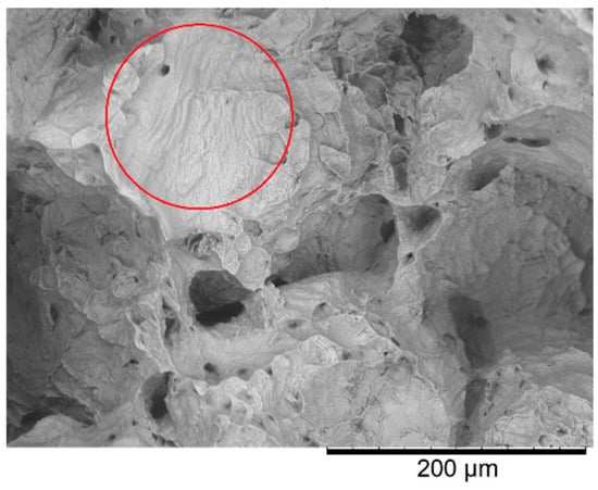 SEM fractographs that were obtained from the Ti-6Al-4V alloy creep tested at 700 °C, and 319 MPa are displayed in Figure 14. This parabolic shape indicates shear failure. The region that is circled in red shows the formation of slip lines [60]. The presence of these slip lines shows the ease with which the dislocations by-pass microstructural barriers by changing slip planes due to the higher temperature.