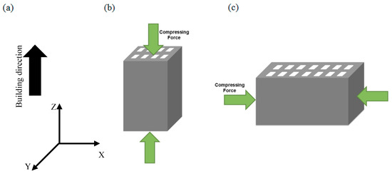 Schematic diagrams of compression tests. (a) Building direction of the samples, (b) Longitudinal compression (LC), (c) Horizontal compression (HC).