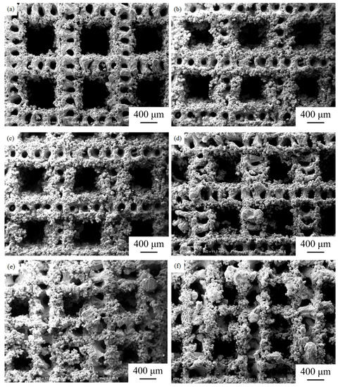 ZK61 (E1) alloy powders were used to determine the laser processing parameters for the preparation of LAMed samples, and the laser processing parameters adopted in this experiment are listed in Table 2. The surface morphologies of LAMed porous ZK61 deposited at different E values are shown in Figure 3. It can be seen that the surface morphologies varied obviously and directly depend on the laser energy input. At a low E of 764 J/mm3, the laser energy is so low that ZK61 powders cannot be melted completely and the “balling effect” [32] and “glue powder phenomenon” on the surface of the samples are serious. With the increasing E at 892 J/mm3, the “balling effect” and “glue powder phenomenon” ease, and when E is between 1019 J/mm3 and 1146 J/mm3, the surface quality of the samples is relatively high. However, with a high E of 1273 J/mm3, excessive laser energy makes the sample surface become rough and uneven. This phenomenon can be explained using the following theory. Due to the lower melting point and boiling point of the magnesium alloy, lower energy input also can adequately melt ZK61 powders to form molten pool, which then absorbed the most of the remaining energy. As a consequence, the temperature of the molten pool quickly reached the boiling point of ZK61 (about 1107 °C). The extremely high vapor pressure (more than 51 KPa) [33] caused by high temperature will make the sample surface rough and uneven. According to Figure 3, the optimum energy density for the preparation of porous ZK61 alloys was 1146 J/mm3.
