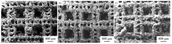 As can be seen from Figure 3, besides the reserved aperture, there are plenty of regular circular or oval holes on the surface of all the samples and the size of these holes is 150–200 μm. It is because that the laser mode adopted in this experiment is pulse laser. The pulse laser has a Gaussian distribution and the instantaneous energy is very high [34], which caused ZK61 powders to evaporate into gas to escape from the sample surface.