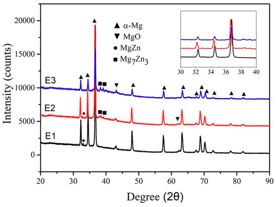 XRD patterns of LAMed porous Mg-Zn-Zr alloys with a wide 2θ = 20–90° are presented in Figure 6. The insert figure is a plane view XRD for 30–40°. E1 was composed of α-Mg, MgO and lesser MgZn phases. When Zn content reached 15 wt.%, besides α-Mg, MgO and MgZn phase, Mg7Zn3 peaks were detected. With further increase of Zn content, MgZn phase almost disappeared and the diffraction intensity of Mg7Zn3 phase increased in E3. It can be inferred that as the Zn content increases, the Mg7Zn3 phase increases as well. Since the content of Zr is less, no phases with respect to Zr were detected.