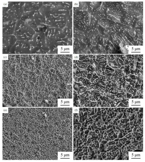 Figure 7 presents SEM micrographs of the molten pool of the LAMed Mg-Zn-Zr alloys, and the corresponding grain size was measured using the intercept method [35]. SEM micrographs of the cross section and longitudinal section of LAMed E1 are shown in Figure 7a,b. Besides the particle/rod-like phases formed inside the grains, there are a small number of phases distributing along the grain boundary. As can be seen from Figure 7c,d, relative to E1, the grain boundary precipitates of E2 increase obviously, and there still exists a large number of particle/rod-like phases inside the grains. In Figure 7e,f, the microstructure of LAMed E3 presents a characteristic of equiaxed α-Mg with fully divorced eutectic distributing reticularly along the grain boundary, however, the particle/rod-like phases inside the grains almost completely disappeared and this phenomenon would be discussed later.