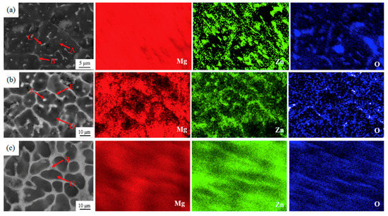 Figure 8 shows EDS images of the LAMed Mg-Zn-Zr alloys and Table 4 summarizes EDS results marked A–H in Figure 8. It can be seen that all the samples exist a certain degree of element segregation. The dark regions were α-Mg matrix, where Zn and O content were relatively low. However, the precipitates (bright regions) were rich in Zn and O elements, and Zn content of grain boundary phase were lower than particle/rod-like phase inside the grains. Since there is no systematic Mg-Zn-Zr phase diagram and the Zr content is relatively low, the Mg-Zn-Zr phase diagram can be roughly replaced by the Mg-Zn phase diagram. According the Mg-Zn phase diagram [42] and XRD results, it can be determined that the grain boundary phase of the LAMed Mg-Zn-Zr alloys is Mg7Zn3 phase, while the particle/rod-like phase inside the grain is MgZn phase. Because the diffusion of extraneous O atoms along the grain boundary is faster than that inside the grains [43], the O elements were mainly enriched at the grain boundary. On the basis of the Mg-Zn phase diagram, the limit solid solubility of Zn in α-Mg matrix at the equilibrium state is lesser than 2 wt.%, while the Zn content in α-Mg matrix of E1, E2 and E3 alloys respectively are 6.03 wt.%, 12.05 wt.% and 20.33 wt.%, which is because the rapid cooling effect during LAM process can increase the solubility of Zn in α-Mg. The significant difference in microstructures may lead to a significant difference in mechanical properties like microhardness and compressive performance.
